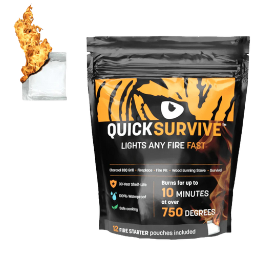 • QuickSurvive® All-Purpose Waterproof Fire Starters are the most versatile fire starters. The QuickSurvive 12 Piece Fire Starter comes packed in a resealable lightweight bag and can be used to start 12+ Fires. Our survival fire starters light when wet, and burn at 750 degrees for up to 10 minutes. If the fire starters get wet or freeze, they will still light as they are 100% waterproof inside or outside of the packet. If you ever light a fire, need a fire, or start charcoal, then you need QuickSurvive. QuickSurvive was designe